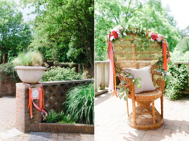 Upon arrival, I gasped at how stunning everything looked. It didn’t hurt that the weather was perfect either. I was immediately drawn to the soft seating area for guests to relax and loved the combination of vibrant fuschia mixed with pale pink and shades of gold. You can see the color scheme flow nicely into the tablescapes, menus and floral.